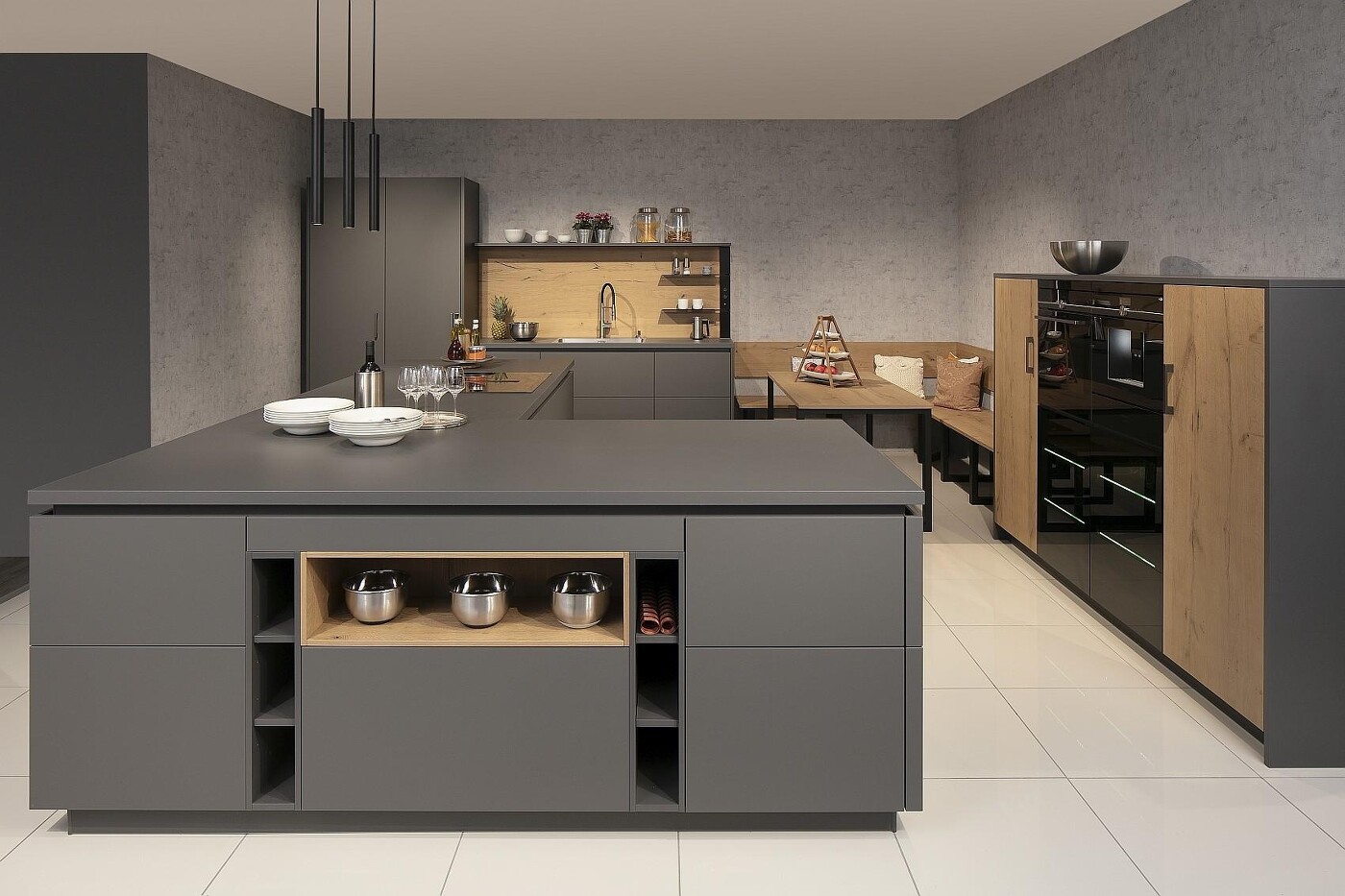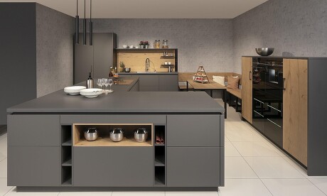 So eine L-Insel kann auch ein bisschen kompakter aufgebaut werden. Wenn Sie Feuer gefangen haben, kommen Sie einfach auf uns zu! Das gezeigte Beispiel der mattgrauen L-Kücheninsel zeigt, dass diese sich auch sehr gut für offene Küchen eignet: Die zum Wohnraum hin zeigende L-Seite wird mit Regaleinschüben versehen, in die man hübsche Gefäße stellen kann, was gleich eine wohnliche Atmosphäre verbreitet.
