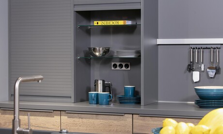 Das nebenstehende Küchenbeispiel zeigt, wie praktisch das ist: Vieles, das man täglich benötigt, kann hier staub- und schmutzsicher den Blicken entzogen und trotzdem griffbereit verstaut werden. Und der Rolladen arrretiert an jeder Stelle, kann also halb, ganz oder nur zu einem Drittel aufgeschoben werden. Ganz ohne dass im geöffneten Zustand Türen im Weg sind :-)