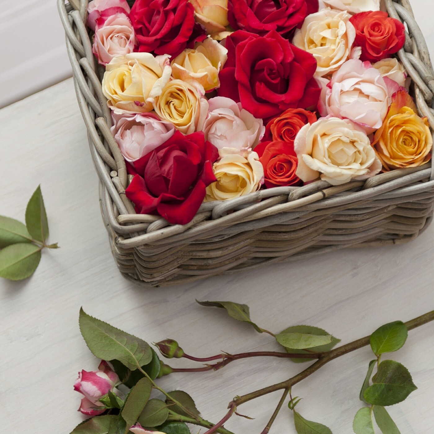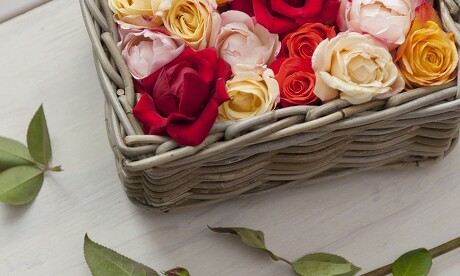 Haben Sie Rosen im Garten? Dann sollten Sie sich auch welche ins Haus holen! Verwenden Sie für unseren Deko-Tipp diejenigen Rosen, die sowieso schon weit aufgeblüht sind. Schneiden Sie sie direkt unter der Blüte ab, also ganz ohne Stiel. Die einzelnen Blüten setzen Sie eng an eng in einen flachen Weidenkorb oder eine flache Glasschale.