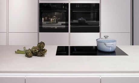 Der Trend zum Schwarz hält an und sorgt dafür, dass auch die Gerätehersteller möglichst viel schwarz gestalten, das früher noch silbern hervorblitzte: Ehemalige Edelstahlelemente werden entweder durch schwarze ersetzt oder weggelassen und kommen mit griffloser Gestaltung aus, bei der sich Gerätetüren durch Antippen oder auf Zuruf öffnen. Letzteres hilft, Fingerabdrücke zu vermeiden, denn gerade wenn die Ausführung in Schwarzglas erfolgt, werden sie störend sichtbar.