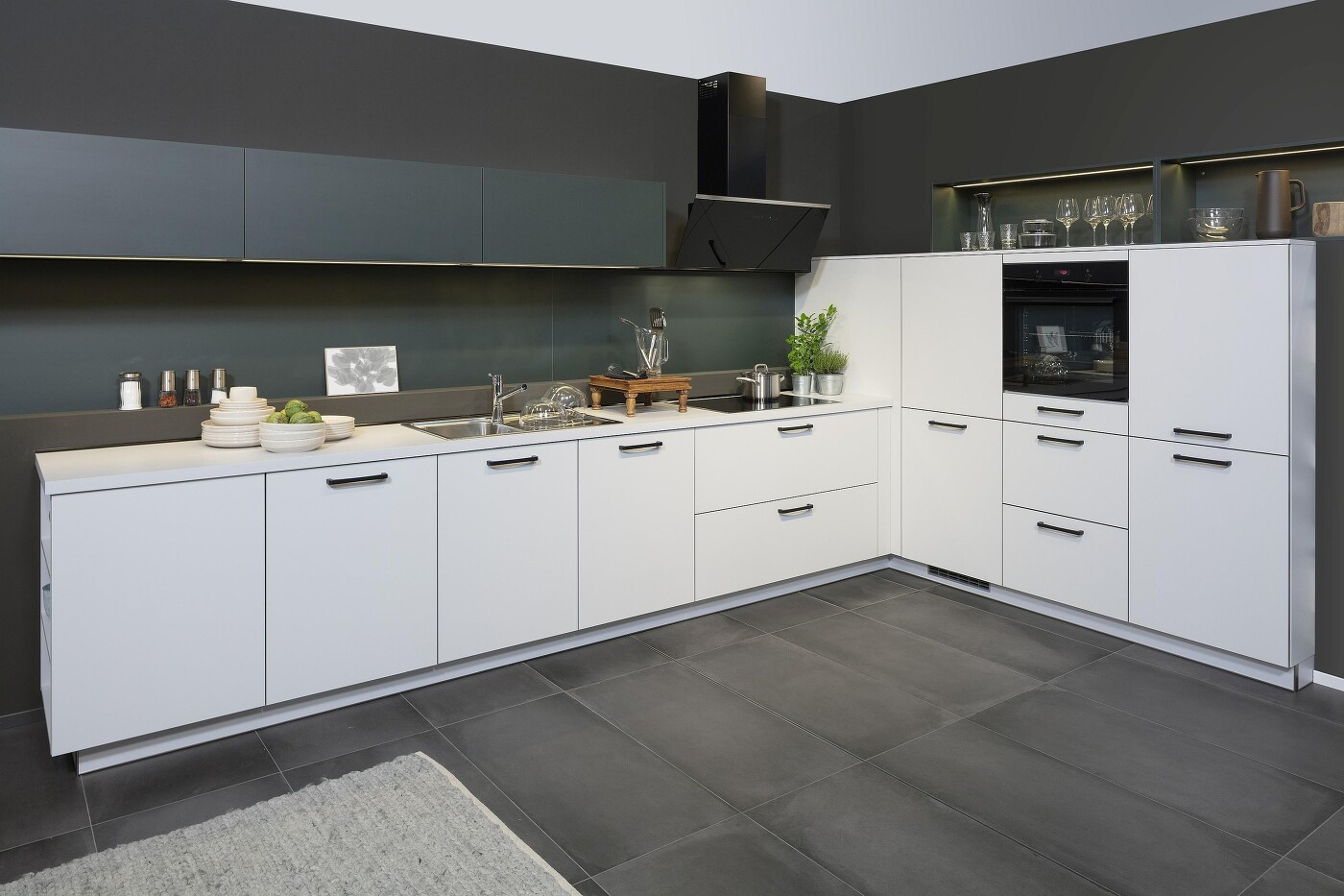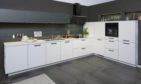 Ohne Oberschränke sehen Küchen ja gleich umso wohnlicher aus, aber meistens kann man wegen Stauraummangel schlichtweg nicht darauf verzichten. Was Sie aber tun können, ist, die Oberschränke optisch zu verbergen. Das Küchenbeispiel zeigt, wie's geht: Mit einer zweifarbigen Gestaltung, bei der die Unterschränke am besten in Weiß und die Oberschränke in einem sehr dunklen Farbton und ohne Griffe gestaltet sind. In diesem Fall handelt es sich um die neue Farbe Blackgreen. Der entscheidende Clou ist natürlich, dass die Wand dahinter in genau derselben Farbe gestrichen ist. Dadurch verschwinden die Oberschränke beinahe im Hintergrund. Der Effekt ist frappierend, oder nicht?!