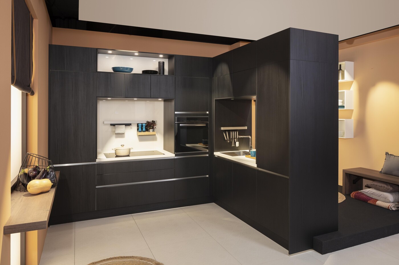 Das abgebildete Küchenbeispiel zeigt, wie sich die Zeile einer L-Küche als Raumteiler nutzen lässt – samt Oberschränken! Denn auch für so eine Anordnung bieten die Küchenhersteller inzwischen funktionale und stabile Lösungen. Gerne zeigen wir Ihnen mehr!