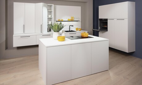 Ein neuer Trend: Erst waren es Unterschrankzeilen, die wandhängend montiert wurden. Inzwischen ist es möglich, ganze Küchen- und Gerätehochschränke ohne Sockel stabil in der Wand zu verschrauben, sodass sie hoch über dem Küchenboden hängen. Diese aus der Badplanung inspirierte Gestaltung verleiht Küchen eine elegante, minimalistische Anmutung und sorgt zugleich für eine optische Vergrößerung des Raums, da mehr Bodenfläche sichtbar bleibt.