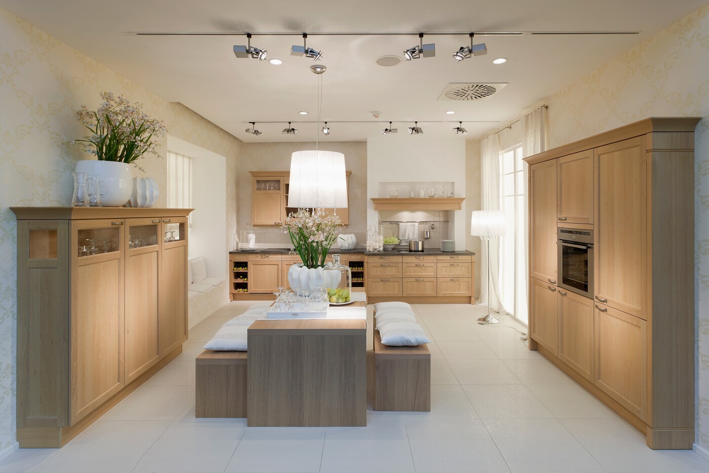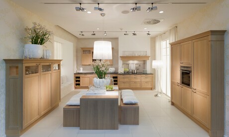 Moderne Landhaus-Küchenmöbel bilden den schönen Rahmen für diese Esstisch-Gruppe, die auf Stühle verzichtet und stattdessen ganz auf funktionale Holzbänke setzt, die Lehnen-los freien Blick erlauben und Platz für viele Gäste bieten.