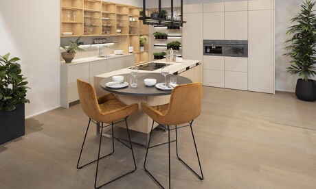 Schon mitbekommen, dass Rundungen der neue Trend im Küchendesign sind? Aber muss man deswegen gleich die vorhandenen Küchenmöbel austauschen? Keinesfalls! Hier ist eine schöne Gestaltungsidee, die wir auf der Messe entdeckt haben und die zeigt, wie gut rund und eckig zusammenpassen: mit einem kreisrunden Ansatztisch an der Küchentheke oder Kücheninsel.