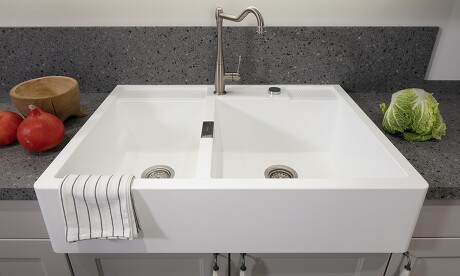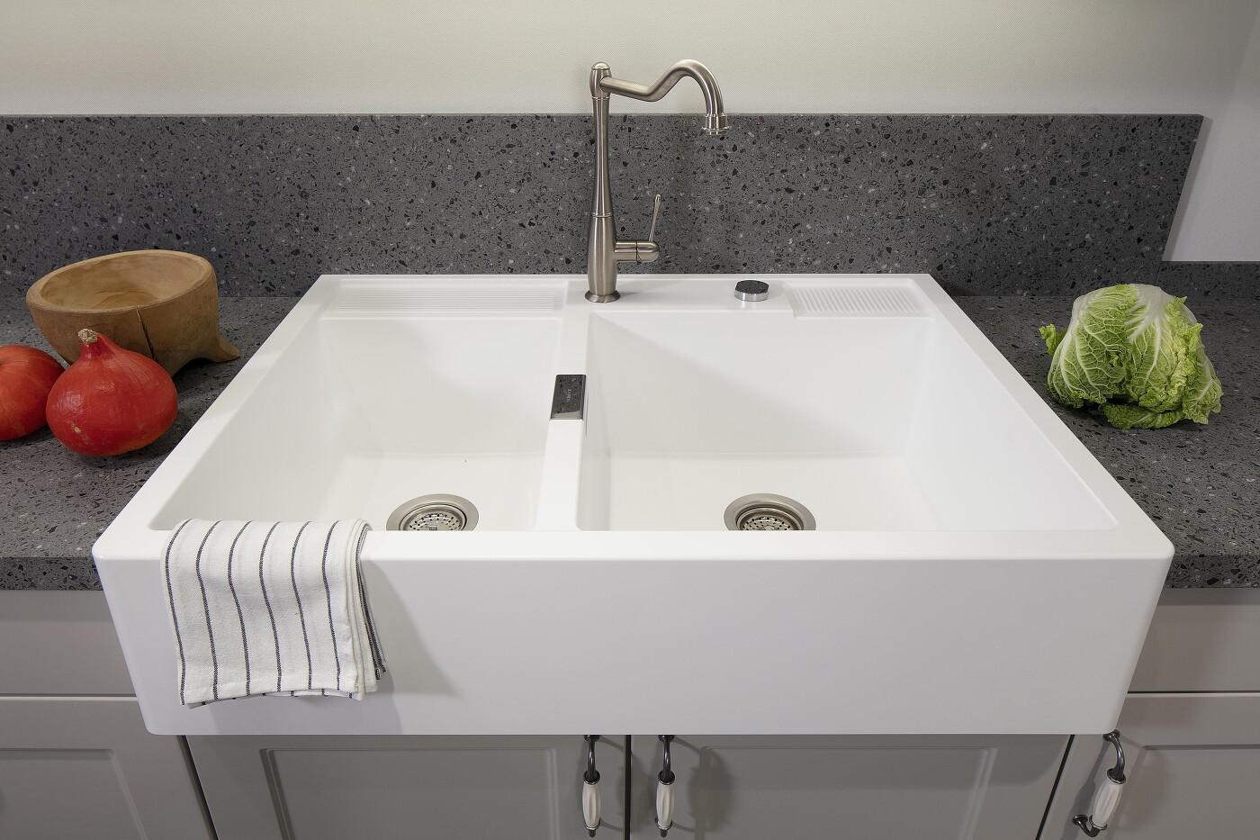 So eine wuchtige Keramikspüle, die nach vorne rausragt, ist für jede Landhausküche das Tüpfelchen auf dem i. Wenn Sie wie wir Wert auf solche Details legen, sind wir genau die richtigen Küchenplaner für Sie. Und keine Sorge: Solche authentischen Spülsteine gibt es auch mit nur einem Becken und sogar auch in Schwarz. Fragen Sie einfach bei uns nach. Wir freuen uns auf Ihren Anruf oder Besuch in unserer Küchenwerkstatt!